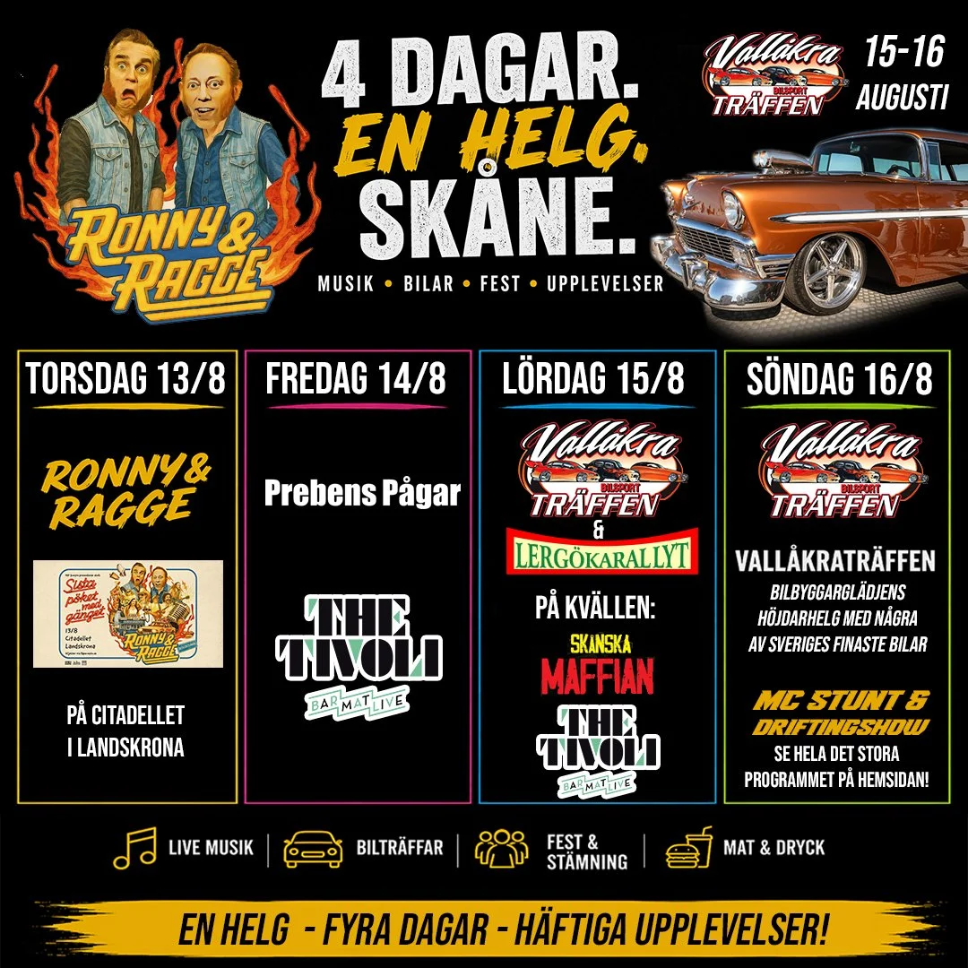Under lördagen & söndagen står Vallåkraträffen i centrum, med ett tvådagarsprogram fyllt av allt från målgång i Lergökarallyt, Sundets Pärla Veteranlastbilsträff och Bilsport Classic Hot Rod Parade, stor final i bland annat Sveriges häftigaste Volvo, American Street Custom och Bilsport Årets Bygge, Mc-stunt & Driftinguppvisningar och mycket mycket mer.